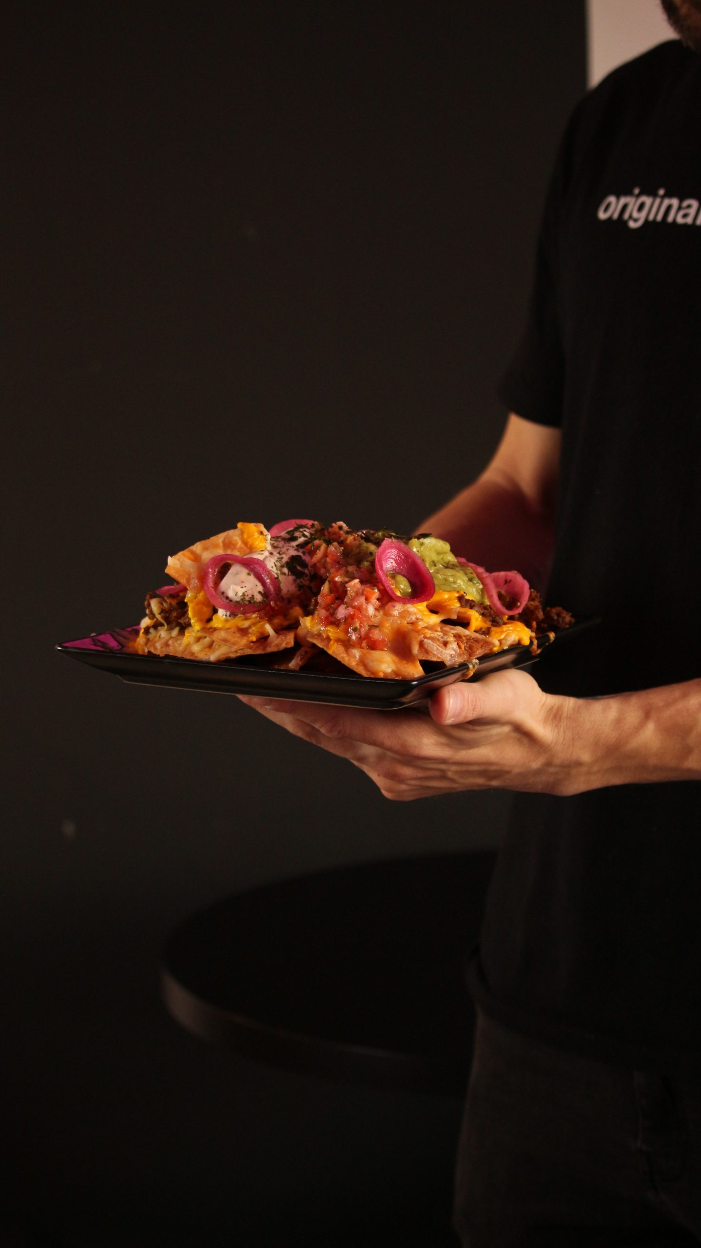 Nachos caseros con guacamole, carne picada, pico de gallo, salsa cheddar, crema agria y queso mix gratinado.